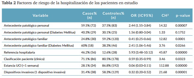 Entre los factores de riesgo vinculados a la hospitalización, se identificaron con significancia estadística variables como antecedentes patológicos personales, referencia hospitalaria y el uso de dispositivos médicos invasivos, especialmente sonda Foley, catéter venoso central y tubo endotraqueal. Asimismo, se identificaron factores protectores significativos como el antecedente patológico familiar, clasificación clínica, el uso de un solo dispositivo médico invasivo, empleo de bránula, monoterapia farmacológica y estancia en UCI menor de una semana.