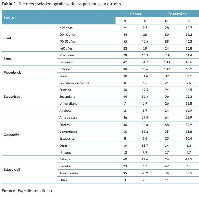 En relación con la procedencia, se encontró que la mayoría de los pacientes provenían de zonas urbanas (68.6% en casos vs. 62.9% en controles), aunque sin significancia estadística (OR 1.28, p=0.1480), lo que puede explicarse por la ubicación geográfica y carácter de referencia nacional de los hospitales incluidos en el estudio. En lo que respecta al nivel educativo, predominó la escolaridad primaria tanto en casos (49.5%) como en controles (42.5%), sin que se identificara asociación estadística significativa (OR 1.32, p=0.1065), aunque se reconoce que un menor nivel de escolaridad puede influir indirectamente en la comprensión de medidas preventivas y en la adherencia terapéutica.