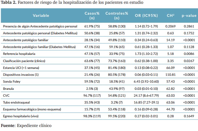 El estudio concluye que existen factores sociodemográficos, clínicos y microbiológicos estadísticamente significativos asociados al desarrollo de infecciones asociadas a la atención en salud (IAAS) en pacientes ingresados en UCI. Se identificó como población predominante a hombres entre 40 y 60 años, provenientes de zonas urbanas, con escolaridad primaria y estado civil soltero. Entre los principales factores con asociación de riesgo con significancia estadística se encontraron el sexo masculino, antecedentes patológicos familiares, referencia hospitalaria y el uso de dispositivos invasivos como sonda Foley, catéter venoso central y tubo endotraqueal. Mientras que la estancia intrahospitalaria menor a una semana, la clasificación clínica no quirúrgica, el uso de un solo dispositivo médico y el esquema antibiótico simple mostro una asociación de protección. La infección más frecuente fue la del torrente sanguíneo asociada a catéter, seguida por neumonía asociada a ventilación mecánica, siendo la Pseudomonas aeruginosa y Staphylococcus aureus los agentes etiológicos predominantes, con una tasa de resistencia del 33.9%. Los resultados respaldan la hipótesis de que múltiples factores están asociados al riesgo de IAAS en pacientes críticos.