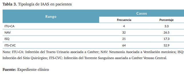 En cuanto a la tipología de las IAAS identificadas, la infección del torrente sanguíneo asociada a catéter venoso central (ITS-CVC) fue la más frecuente (52.9%), seguida por la neumonía asociada a ventilación mecánica (NAV) con 26.5%, la infección del sitio quirúrgico (ISQ) con 17.3%, y la infección del tracto urinario asociada a catéter (ITU-CA) con 3.3%, reflejando el predominio de infecciones relacionadas con dispositivos invasivos, concordante con la literatura, (tabla 3).