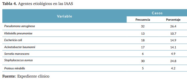 En el análisis microbiológico, los principales agentes etiológicos aislados fueron Pseudomonas aeruginosa (26.4%), Staphylococcus aureus (24.8%), Escherichia coli (14.9%) y Acinetobacter baumannii (14.1%), patógenos ampliamente reconocidos por su participación en infecciones nosocomiales severas y por su alta capacidad de resistencia antimicrobiana, (tabla 4).
