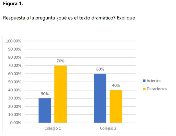 La figura 1 muestra, los resultados de la prueba diagnóstica aplicada en la primera fase de la secuencia, en esta se les pregunta ¿qué es un texto dramático? De tal modo, que en el colegio 1 los estudiantes cometieron muchos errores, demostrando que no poseen ni al menos conocimientos básicos, mientras que en el colegio 2 un mayor número de estudiantes con respecto al colegio 1, demostró a través de sus respuestas que tienen dominio sobre los textos dramáticos.