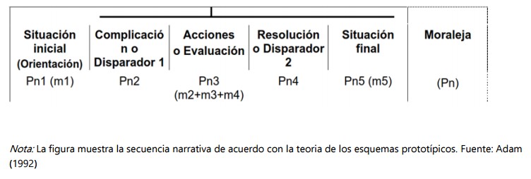 En la cuarta sesión está enfocada en la construcción del guion. Para esto se propone un proceso de coevaluación en donde los estudiantes comparten sus propuestas por medio de una exposición y se autoevalúan con la lista de cotejo facilitada por el docente. Posteriormente, a partir de una plantilla se inicia la adecuación del guion. Esta se estructura de acuerdo con la secuencia narrativa de Adam (1992) la situación inicial, las acciones y la moraleja. La siguiente figura muestra la relación argumental o sucesiones de las macroproposiciones narrativas: