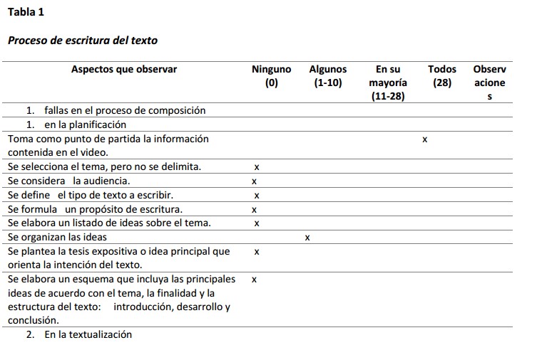 Según Alberdi (2008), la estructura del texto debe presentar ciertas características cuestiones que no están presentes con total claridad en los escritos encontrados y su análisis a partir del estudio sobre su situación actual en cuanto a la escritura de un texto académico. Para ello se utiliza la guía de observación, la lista de cotejo y la rúbrica para valorar los textos expositivos redactados. La guía de observación fue diseñada específicamente para identificar las principales dificultades de los estudiantes en el proceso de composición del texto expositivo, y se planea en torno a varias categorías clave. La categoría principal identificada fue las dificultades en el proceso de composición, que incluyeron subcategorías relacionadas con diferentes fases del proceso de escritura, tales como la planificación, la textualización, la revisión, la corrección y la evaluación. Este análisis permitió identificar áreas críticas en las que los estudiantes necesitaron apoyo en la intervención didáctica, y sentó las bases para mejorar sus habilidades en la redacción de textos expositivos.