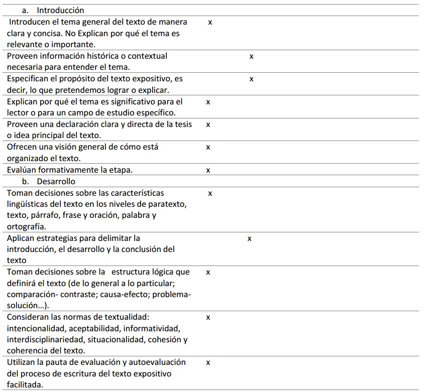 La prueba diagnóstica se trató sobre la creación de un texto expositivo a partir de una propuesta de la docente investigadora. Para esto, se utilizó una lista de cotejo para identificar y compartir fortalezas y dificultades en la redacción. Esta evaluación no tuvo una calificación numérica, sino descriptiva de las capacidades de los estudiantes centrándose en las propiedades textuales, la estructura y el proceso de composición del texto (Muñoz Rodríguez & Pérez Álvarez, 2021).