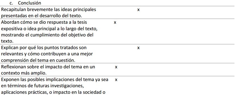 En la conclusión del texto se evidencio mayor dificultad para condensar las ideas principales y vincularlas con la tesis planteada. El análisis crítico de la importancia del texto redactado y su proyección futura fue escaso. Rizaldi & Hastini, (2023) menciona la dificultad que se presenta en muchos de los estudiantes actualmente lo que se evidencia en algunos puesto que no se esforzaron con cerrar el texto con enunciados que sorprendieran al lector, la mayoría de los estudiantes no logró plasmar implicaciones de mayor importancia ni concluir el escrito con una visión integradora.