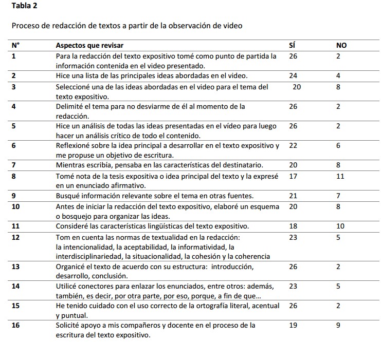 La lista de cotejo que se implementó a los sujetos de estudio permitió la identificación de importantes fortalezas en el proceso de redacción de textos expositivos. Según los resultados ellos utilizaron el video como fuente para la creación del texto, extrayendo las ideas que interpretaron para la formulación del tema, lo cual demuestra comprensión lectora y disposición para trabajar a partir otras fuentes diversas de información que no sean textos escritos. De igual modo, la gran mayoría demostró la identificación de las ideas principales y delimitar el tema, lo que refleja capacidad en la estructuración del contenido previo a la escritura. También, demostraron capacidad para determinar el tema lo que constituye un elemento clave en la redacción expositiva, pues permite que se aplique la coherencia y enfoque en el desarrollo del texto.