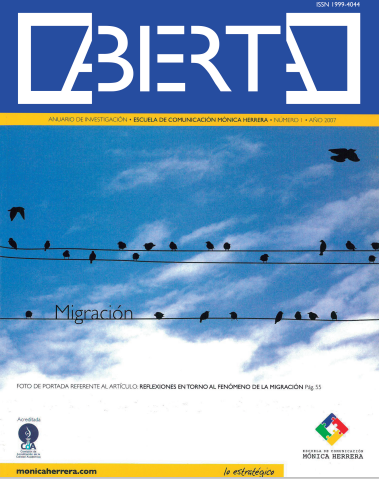 Núm. 1 (2007)Este primer Anuario de Investigación ha sido diseñado especialmente para transmitir conocimientos de investigación en el área de las comunicaciones. Es un medio que pretende transmitir la calidad de las investigaciones realizadas por toda la comunidad académica de nuestra institución. Abierta, busca acoger con agrado la colaboración ofrecida, así como todos los temas que nos afectan desde cualquier perspectiva en el área de las comunicaciones.