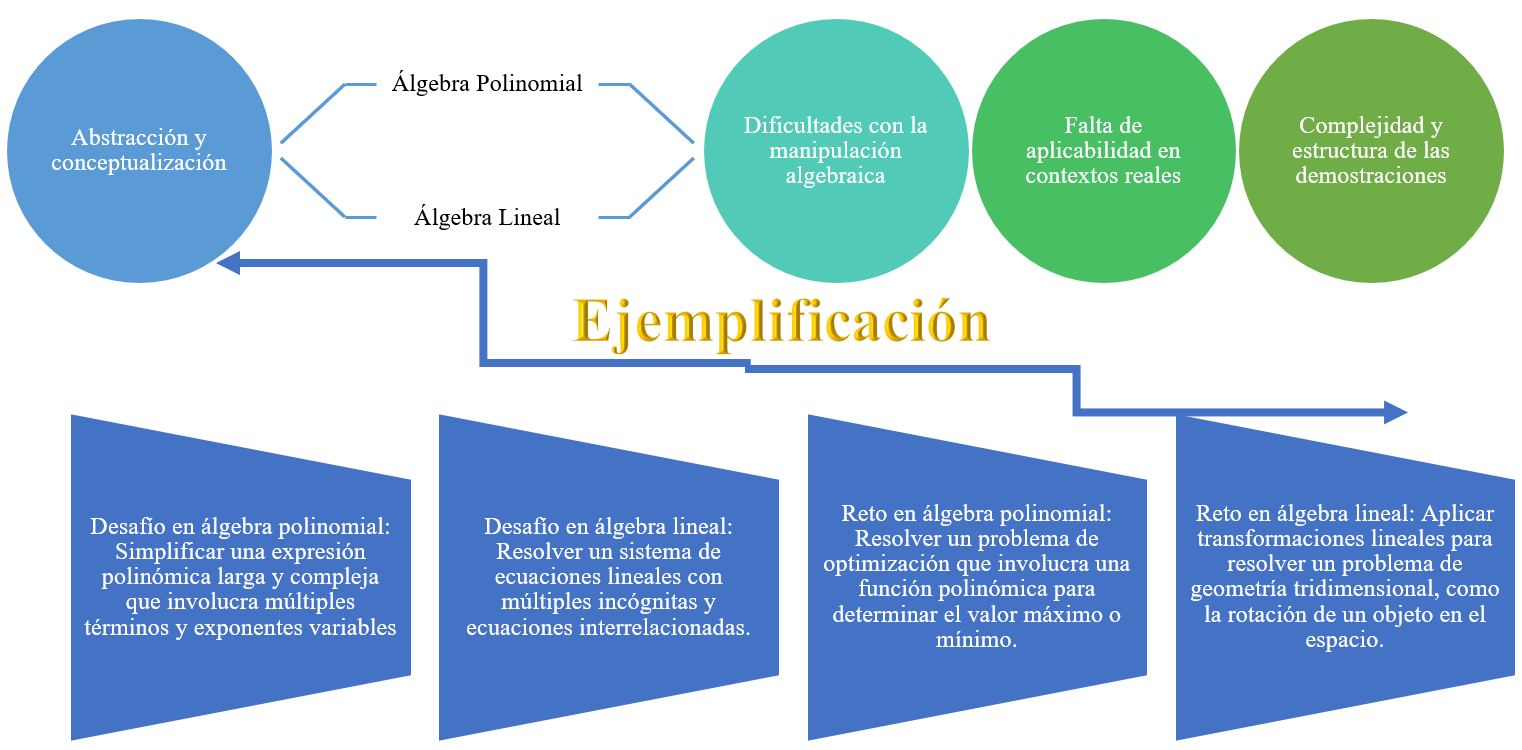 En la figura 3 se muestran los principales retos y desafíos a los que se enfrentan los estudiantes de matemáticas y además un ejemplo de retos y desafíos en álgebra polinomial y lineal un desafío común en el álgebra polinomial es la simplificación de expresiones polinómicas largas y complejas. Por ejemplo, si se considera la expresión polinómica: