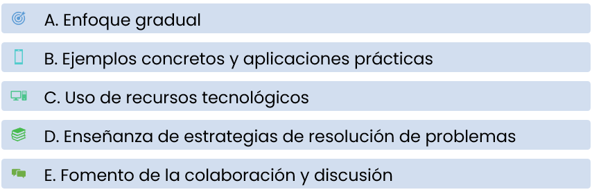 Comenzar con conceptos y problemas más simples y progresar hacia niveles de dificultad más altos. Esto permite a los estudiantes construir una base sólida y desarrollar gradualmente habilidades más avanzadas. Por ejemplo, en lugar de introducir de inmediato expresiones polinómicas complejas, se pueden comenzar con expresiones más simples y luego aumentar gradualmente la complejidad a medida que los estudiantes adquieran confianza y comprensión.