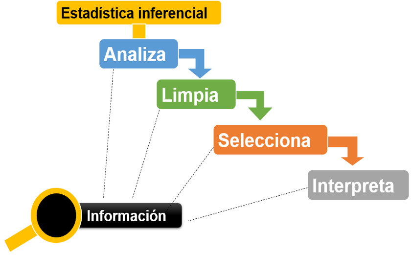 Asimismo, no solo aborda un grupo de datos, sino que establece relaciones entre varios grupos. Por consiguiente, puede ser que solo se conozca una parte del o los grupos de datos a estudiar. Cualquiera que sea el caso existen ciertos pasos para el análisis estadístico los cuales se muestran en la siguiente figura: