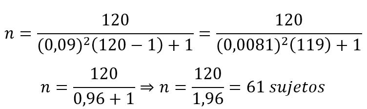 Por ejemplo, si la población está integrada por 120 sujetos, considerando un error de estimación de 0,09, se tiene: