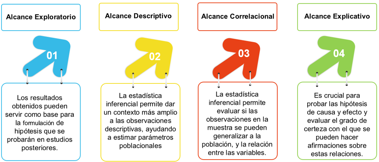 Todo lo anterior da lugar a lo siguiente: La estadística inferencial desempeña un papel fundamental en la realización de investigaciones porque permite realizar generalizaciones y conclusiones sobre toda la población a partir de una muestra preseleccionada. Dependiendo del tipo de alcance de la investigación, la estadística inferencial puede influir de diferentes maneras: En pocas palabras es una herramienta clave que permite generalizar los resultados de una muestra a contextos más amplios, independientemente del alcance de la investigación.