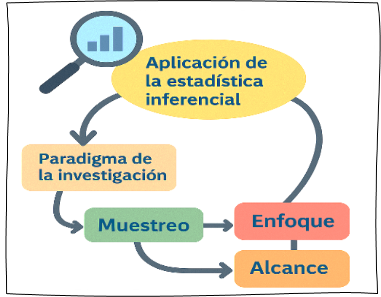El esquema gráfico ilustra de forma visual y didáctica cómo la estadística inferencial se posiciona como un eje articulador dentro del proceso de investigación científica, relacionándose con componentes clave como el paradigma de la investigación, el enfoque, el muestreo y el alcance del estudio. La estadística inferencial depende de un muestreo adecuado, puesto que se basa en los datos de la muestra para hacer predicciones sobre la población total. Si el muestreo es sesgado, las inferencias serán poco confiables. Por consiguiente, esto define el nivel de profundidad del estudio ya sea de tipo: exploratorio, descriptivo, correlacional o explicativo.