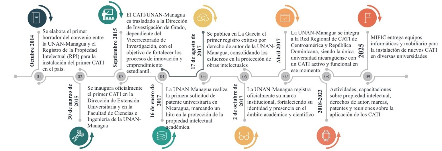 A través del establecimiento de los CATI en Nicaragua se le da respuesta a la necesidad de fortalecer el ecosistema de innovación y protección de la propiedad intelectual en el país. El primer CATI se puso en marcha el 30 de marzo de 2015 en la Universidad Nacional Autónoma de Nicaragua, Managua (UNAN-Managua), mediante un convenio con el Registro de la Propiedad Intelectual (RPI) del MIFIC (Salazar, 2017). Este suceso, dio el inicio de un proceso de expansión que, a la fecha, ha logrado la creación de siete CATI en diferentes casas de estudios superiores del país.