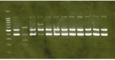 Figure 3. Gelred Well 1. Molecular marker, well 2 positive control, well 3 to 12 patient, 11 negative control.