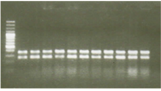 Figure 2 GelRed Well1. Molecular marker, well 2 positive control, well 3 to 10 patients, 11 negative control.