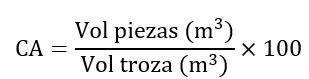 Para determinar el coeficiente de aserrío, se utilizó la fórmula propuesta por (Chávez, 1997) que relaciona el volumen calculado de las piezas de madera aserrada obtenida y el volumen de la madera en rollo utilizada, se aplica la siguiente ecuación: