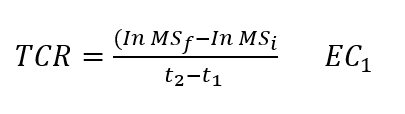 Donde ln MSf y ln MSi son los promedios del logaritmo natural de la materia seca (g) final e inicial, respectivamente, y t2 – t1 es la diferencia de tiempo (días) entre dos cortes sucesivos.