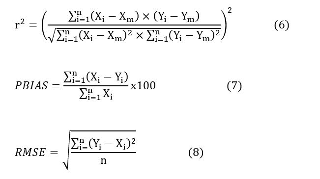 r2: coeficiente de determinación lineal, PBIAS: porcentaje de sesgo, RMSE: raíz