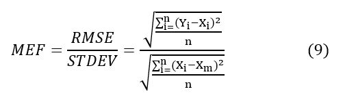 Debido a que el RMSE puede resultar con un valor muy grande, ya que depende de la escala de valores de las series de datos, es difícil determinar su magnitud sin un punto de referencia, por lo cual se introduce la variable error cuadrático medio normalizado (MEF) que normaliza el RMSE con respecto a la desviación estándar, y poder evaluar la eficiencia de la ecuación de correlación, mientras más bajo es MEF mejor es el desempeño del modelo, varía de 0 a α (Zhong y Dutta, 2015).