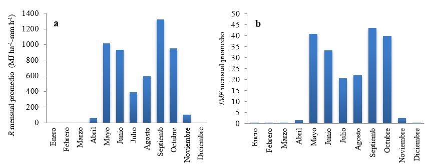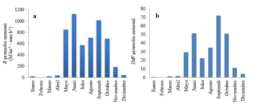Arnoldus (1977) también demuestra que existe una alta correlación entre el índice de erosividad Ra y el índice IMF. Los resultados concuerdan muy bien con los valores de aquellas estaciones para las cuales el índice Ra ha sido calculado con el método del RUSLE. Los resultados anteriores fueron confirmados por Renard y Freidmund (1994) en Estados Unidos de América (EE. UU.) con un alto coeficiente de correlación. El IMF ha sido utilizado en estudios para estimar Ra en varios países como Colombia (Rivera y Gómez, 1991), España (De Luis et al., 1997; Pérez y Senent, 2015) y Marruecos (Saldaña et al., 2014). Se determinaron los valores mensuales del IMF en las estaciones pluviográficas derivados de la ecuación (5), dividiendo el cuadrado de la precipitación del mes en cuestión (Pi2) por la precipitación promedio anual de la serie (P), de esa forma se obtiene un IMF para cada mes.