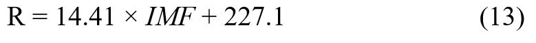 Se obtuvo la ecuación de correlación lineal para los datos índice de erosividad de la lluvia Rmese índice modificado de Fournier IMF mensual de la estación Jinotega, para el período 1996-2015. El coeficiente de determinación es r2 =0.74, indicando que hay una buena relación lineal entre las variables IMF mensual y R mensual. La ecuación de correlación obtenida es: