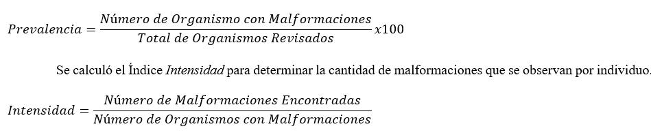 Los datos registrados fueron almacenados en el programa Microsoft Excel, en su versión 2013. La base de dato se trabajó en un formato de tabla previamente diseñado. El análisis descriptivo fue realizado con el software Rstudio (de acceso libre). En cuanto a las malformaciones congénitas se empleó el índice de Prevalencia, que muestra la proporción de organismos en los que se observó al menos una malformación.