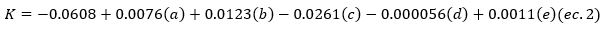 propuesto K= -0.0608+0.0076(a) + 0.0123(b) - 0.0261(c) - 0.000056(d) + 0.0011(e), encontró que las variables: porcentaje de limo (a), porcentaje de arena muy fina (b), contenido de materia orgánica ( c), permeabilidad superficial (d) y estabilidad de
