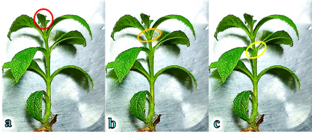 Se estudió la respuesta de nueve tipos de segmentos de tallos: yema apical individual, segundo entrenudo individual y tercer entrenudo individual (Figura 1); segmento de tallo con yema apical, yema apical con dos entrenudos y yema apical con tres entrenudos (Figura 2); segmentos de tallo con un entrenudo sin yema apical, segmentos de tallo con dos entrenudos sin yema apical y segmentos de tallo con tres entrenudos sin yema apical (Figura 3).