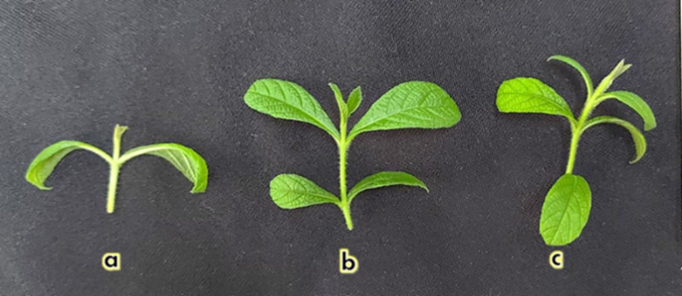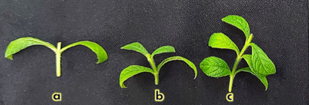 En esta primera fase, a las cuatro semanas después de realizada la siembra de los segmentos de tallo, se evaluó el número de hojas en plantas formadas en los BEIT según el tipo de segmentos. El proceso consistió en contabilizar el número de hojas nuevas producidas por los segmentos de tallo. En plantas como teca, la producción de hojas por planta es muy importante, porque en la base del pecíolo se encuentra una yema axilar que brotará cuando se corte cada segmento de tallo, y en el caso de los segmentos de tallo que tienen su yema apical, por acción de los constituyentes del medio de cultivo líquido o semisólido, continuarán con su crecimiento.