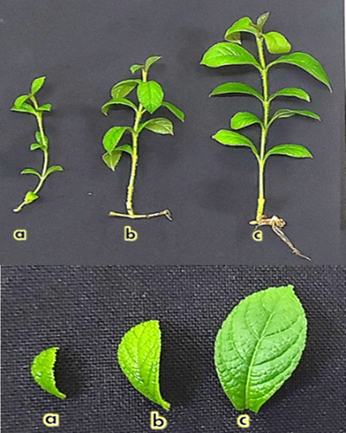 A las cuatro semanas, se tomaron 15 plantas al azar por tratamiento y a cada una se le evaluaron cuatro variables: a) número de hojas producidas por segmentos de tallos; b) longitud del tallo, considerando la longitud de la base de la planta hasta la yema apical y en el caso de los segmentos de tallos que se les eliminó la yema apical, se midió la longitud del brote principal axilar; c) el número de raíces producidas por segmentos de tallo y d) vigor de las plantas, en esta variable se definió una escala de vigor de acuerdo a las expresiones morfológicas de las hojas formadas: Bajo vigor: hojas del segundo entrenudo con ancho < 0.50 cm y largo < de 1 cm y longitud de tallo < de 8 cm. Vigor mediano: hojas del segundo entrenudo con ancho entre 0.5 y 1 cm y largo entre 1 cm y 2 cm, con longitud de tallo entre 8 cm y 10 cm. Las hojas con Buen vigor corresponden a aquellas en el segundo entrenudo con ancho > a 1cm y largo > a 2 cm, con longitud de tallo > de 10 cm (Figura 4).
