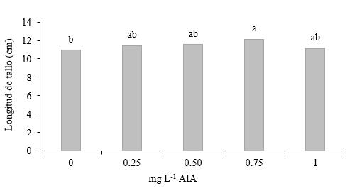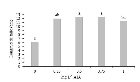 Longitud del tallo en segmentos de tallo con dos entrenudos sin yema apical. En longitud de tallo, los tratamientos que contenían dosis de 0.50 y 0.75 mg L-1 de AIA obtuvieron medias de 12.35 cm y 12.37 cm, superando a las medias logradas en los tratamientos sin adición de AIA y con 1.00 mg L-1 de AIA, con medias respectivas de 6.10 cm y 11.40 cm (Figura 10).