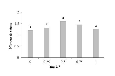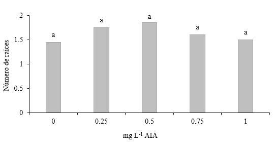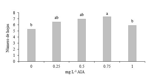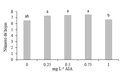 Número de hojas en segmentos de tallo con dos entrenudos sin yema apical. El número de hojas obtenida con la adición de 1.00 mg L-1 de AIA resultó significativamente inferior a las logradas con adiciones de 0.25, 0.50 y 0.75 mg L-1 de AIA (Figura 11).