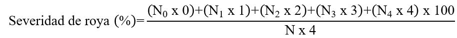 Severidad de roya (%). Se utilizó la metodología empleada por la Secretaría de Agricultura, Ganadería, Desarrollo Rural, Pesca y Alimentación (SAGARPA, 2013), quien emplea una escala que presenta un porcentaje de daño desde el grado cero, que representa la hoja completamente sana, hasta el grado 4, que es una hoja con más del 50 % de su área afectada. En el Cuadro 1, se indica el grado de severidad en función del porcentaje de daño ocasionado por la roya del café.