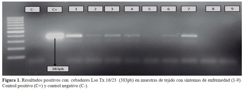 Presencia de Candidatus liberibacter solanacearum con los cebadores Lso TX 16/23.