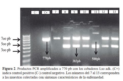 En ambos productos PCR, se visualizaron los resultados colocando 20 ul de las muestras con 4 ul de 6X loading Dye en un gel de agarosa al 1.2% que fue teñida con bromuro de etidium antes de solidificar, el gel se colocó en una cámara de electroforesis con buffer TBE 0.5X se corrió durante 90 min a 90 voltios, y se colocó en un transluminador para verificar la presencia o ausencia de la bacteria en las muestras y se registró mediante fotografía. Se consideraron muestras positivas a las que tuvieron una amplificación de fragmentos de acuerdo a los cebadores utilizados Lso TX 16/23 que amplifica a 383 pb y Lso adk que amplifica a 770 pb.