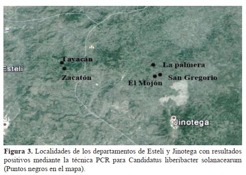 Several important phytosanitary problems have been recorded in potato cultivation due to the presence of viruses, bacteria and fungi. In recent years, producers in the departments of Estelí and Jinotega have reported plants with symptoms of the Zebra disease chip caused by the fastidiosa bacterium Candidatus liberibacter solanacearum. The Zebra chip disease has caused large economic losses to potato producers in the country where the production is developed all year. Faced with this problem, the Nicaraguan Institute of Agricultural Technology (INTA), together with the National Agrarian University (UNA), conducted a study between August 2015 and July 2016 with the objective of generating information related to the presence and distribution of Ca. Solanacearum in the above mentioned departments. A total of 162 tissue samples with disease symptoms were collected from four locations in Jinotega and three locations in Estelí during the three cropping cycles. Tissue samples were processed and analyzed at the National Center for Agricultural Research and Biotechnology (CNIA-INTA) to detect causative agent Ca.l. Solanacearum using the molecular primers bound to the bacterium Lso Tx 16/23 and the cleansing gene Lso adk. 50 samples were positive with the Lso Tx 16/23 primer indicating high specificity for the detection of this pathogen, whereas with the Lso ADK primers 42 samples were positive presenting polymorphisms. The bacterium was detected in the areas of El Tayacán and El Zacatón in the department of Estelí and in the department of Jinotega El Mojón, La Palmera and San Gregorio. The highest percentage of affection for Ca. L. solanacearum was presented in Jinotega with 52.17% compared to Estelí that presented 22.41% of the samples collected.