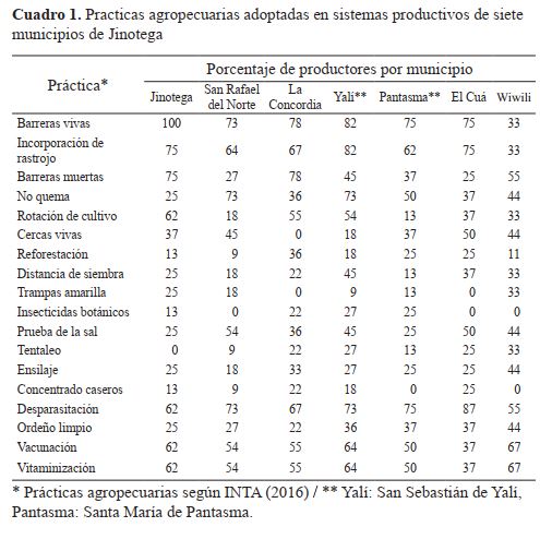 En el cuadro 1 se detalla el porcentaje de productores por municipio que han adoptado las prácticas identificadas; por ejemplo, en Jinotega el 100% de los productores utilizan barreras vivas, pero de ese 100%, el 75% también incorporan rastrojos y establecen barreras muertas; y el 62% hacen uso de rotación de cultivos, desparasitación, vacunación y vitaminización.