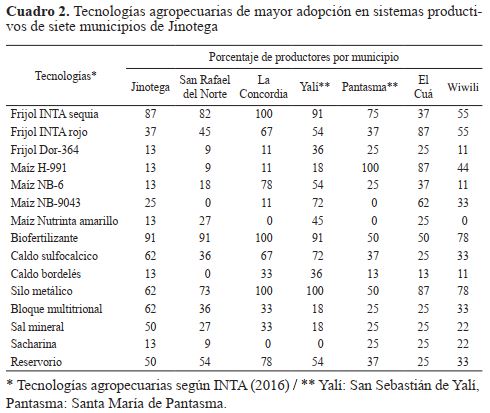 En este estudio se identificaron 87 tecnologías aplicadas en los sistemas de producción, de este total 29 corresponden al uso de semilla mejorada de frijol, maíz, sorgo y arroz (Frijol INTA Sequia, Frijol INTA Rojo, Maíz H-INTA 991, Maíz NB-6, Maíz NB-9043, Frijol INTA Masatepe, Frijol Dor-364, Maíz Nutrinta amarillo, Maíz Nutrader, Frijol INTA canela, Frijol INTA Jinotega, Arroz INTA dorado, Frijol INTA Estelí, Frijol INTA Cárdenas, Frijol INTA Ferroso, Frijol Estelí 150, Arroz INTA Fortaleza, Frijol Estelí 50, Frijol Rojo Seda, Frijol T2, Maíz Mazorca de Oro, Frijol Estelí 90, Frijol INTA Matagalpa, Frijol INTA Nutritivo, Frijol INTA Norte, Frijol INTA Maravilla, Frijol L3, Sorgo Blanco, Sorgo Pinolero), nueve a variedades mejoradas de hortalizas (Ayote Carreta, Chiltoma Tres Cantos, Cebolla Sebaqueña, Tomate INTA Jinotega, Tomate JL-5, Tomate INTA Valle de Sébaco, Pipián Garza, Repollo Izalco, Repollo Escazú), seis en raíces y tubérculos (Papa Desiré, Papa Ona, Papa Granola, Papa Provento, Yuca Perla, Yuca Quintalera), 14 de pasturas (Pasto Brizantha, Caña de azúcar, Caña japonesa, Pasto CT-115, Pasto Gamba, Pasto Maralfalfa, Pasto Mulato, Pasto Mombaza, Pasto Marandú, Pasto Piatá, Pasto King Gras, Taiwán, Pasto Tanzania, Pasto Toledo), cinco de especies forrajeras (Cratylia, Leucaena, Gandul, Marango, Morera), 12 de manejo integrado de cultivo (Bacillus thuringiensis, biodigestor, Beauveria bassiana, bocashi, caldo bordelés, caldo sulfocálsico, neem para el manejo de garrapata, micorrizas, lombrihumos, sustrato, biofertilizante, micro túnel), cuatro de manejo de fuentes de agua (Laguneta, riego por goteo artesanal, reservorio, riego por aspersión artesanal), tres sobre alimentación en época seca para ganado mayor (bloque multinutricional, sal mineral, saccharina) y cinco en manejo post cosecha (caseta de secado, súper bolsa, silo metálico, troja mejorada, túnel de secado).