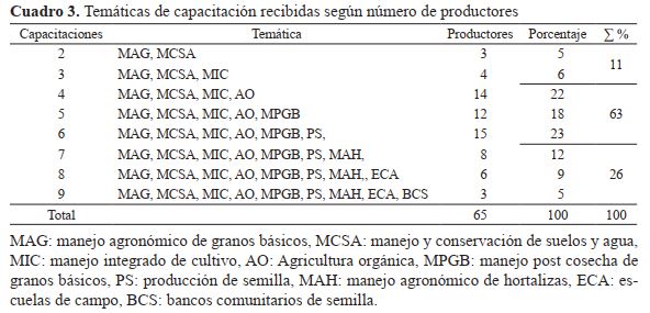 En el cuadro 3 se observar que todos los productores han recibido capacitación sobre manejo agronómico de granos básicos, así como manejo y conservación de suelo y agua; sin embargo, la mayoría (63%) también han sido capacitados en temas como manejo integrado de plagas, agricultura orgánica, manejo post cosecha de granos básicos y producción de semilla. El 26% corresponde al grupo de productores que han recibido entre siete y nueve capacitaciones, siendo este el conjunto con mayor cantidad de capacitaciones recibidas.
