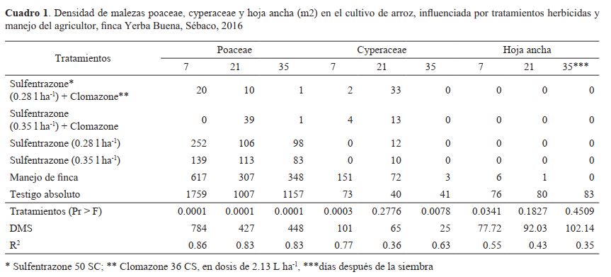 En el cuadro 1, se observa la eficacia de control de poaceas de cada uno de los tratamientos evaluados hasta los 35 dds. Los tratamientos herbicidas fueron aplicados 2 días después del pase de agua (en lodillo), es decir antes que emergieran las malezas poaceas y la plántula de arroz. La abundancia de malezas en estos tratamientos corresponde a la densidad de las malezas Echinochloa colona L y Lepthochloa filiformis (LAN) determinadas posterior a la aplicación de los mismos, lo que significa que el control de este tipo de plantas inicia desde una etapa temprana, lo que no genera competencia alguna para el cultivo de arroz.