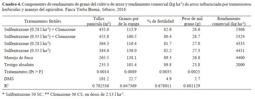 En este estudio se logró observar que el tratamiento Sulfentrazone 0.35 l ha-1 + Clomazone fue el que obtuvo mejor comportamiento en cuanto a rendimiento de grano, pero también en dos de los componentes de rendimiento. Este comportamiento es similar al reportado por CIAT (1986), en el cual se afirma que existen cuatro componentes o factores que contribuyen significativamente al rendimiento de arroz: el número de panículas por unida de área, granos por panícula, el porcentaje de granos llenos (fertilidad de panícula) y el peso de granos llenos. Cada componente se determina o establece en diferentes etapas de crecimiento de planta; así el número de panícula se determina durante la fase vegetativa, el número de granos, durante la fase reproductiva y el porcentaje de granos llenos y el peso de grano, durante la fase de maduración. El tratamiento Sulfentrazone 0.35 l ha-1 + Clomazone presentó mayores unidades de tallos fértiles por unidad de área y el mayor peso de 1000 granos; lo que conllevo a expresar el mayor potencial de rendimiento varietal. Lo anterior está en correspondencia con Ténarrelli (1989), quien señala que el peso entre 20-28 gramos por mil granos, son límites para definir como muy pesado y moderadamente pesado cualquier tipo de arroz. El rendimiento en granos enteros varía en función de la variedad, el grado de maduración, por lo que una maduración imperfecta puede producir menor peso específico y unitario de la semilla.