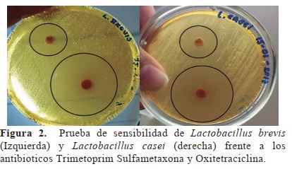 Prueba de sensibilidad a antibiótico. Los aislados de Lactobacillus casei y Lactobacillus Brevis fueron sensibles a Trimetropim Sulfametaxona, debido a que se observaron halos de inhibición mayores a 19 mm, también fueron sensibles a oxitetraciclina con halos de inhibición mayores a 15mm (figura 2). Según los criterios de la NCCLS un microorganismo es sensible a Trimetoprim Sulfametaxona si el halo de inhibición es mayor o igual a 19 mm y son resistentes si el halo es menor o igual a 10mm, en relación a oxitetraciclina los microorganismos son sensibles si los halos son mayores o igual a 15 mm y son resistentes si presentan halos menores o igual 11 mm.