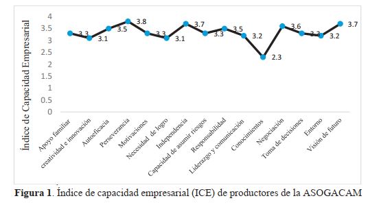 Los resultados indican que los productores de la ASOGACAM tienen un alto índice de capacidad empresarial en todas las variables consideradas, excepto en la variable conocimiento, que tiene un ICE de 2.3 (figura 1).