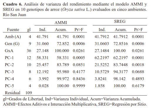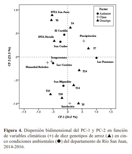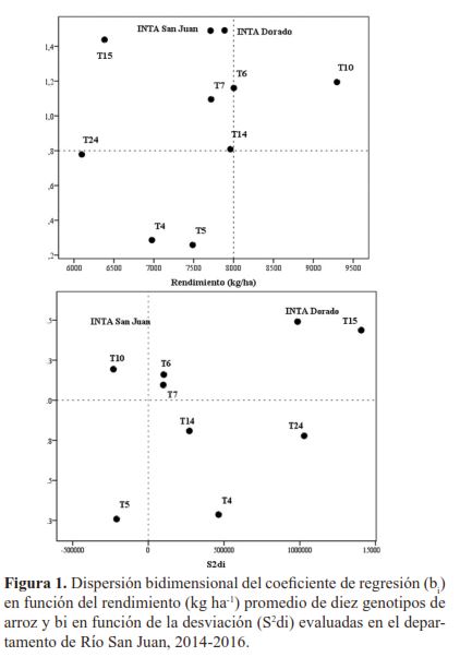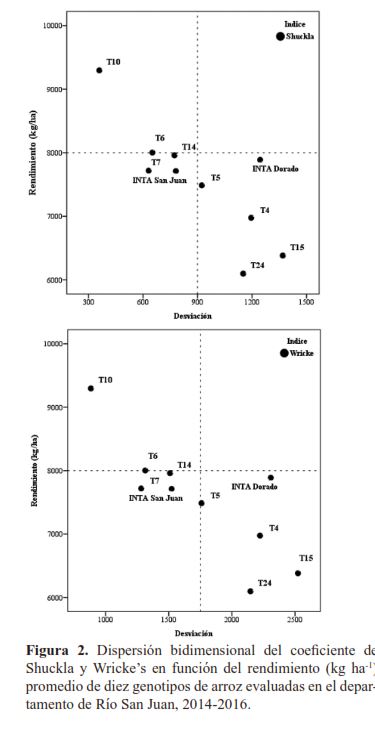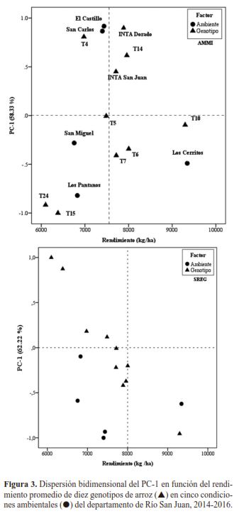 CONCLUSIONESLos resultados revelaron evidencias del comportamiento variante en los genotipos de arroz estudiados. Los genotipos T6, T7, T10 y T14 basado en los modelos de Eberhart y Russel, Shuckla y Wricke’s respondieron bien en la mayoría de los ambientes, por lo que son calificados como estables y de alto rendimiento. Los testigos INTA Dorado e INTA San Juan, tuvieron un buen potencial de rendimiento, pero discrepantes en los ambientes. Las metodologías AMMI y SREG, coincidieron en que los genotipos T15 y T24 fueron inestables, de alta interacción y bajos rendimientos en los ambientes. Asimismo, el modelo AMMI precisó que los genotipos T5 (asociado a San Miguelito) y T10 (asociado a Los Cerritos) aportaron menos a la interacción; comportamiento similar tuvieron los genotipos T4, T5 y T7 (asociado a Los Pantanos). Mediante SREG, las variables de clima relacionaron a los ambientes y genotipos. |