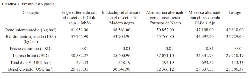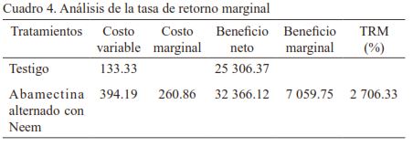 Análisis de la tasa de retorno marginal. Este análisis indica que Abamectina alternado con Neem es el tratamiento más viable económicamente, ya que, por cada dólar invertido, el agricultor obtiene una tasa de retorno marginal de 2 706.33%, es decir que, por cada dólar invertido, se recupera el dólar y se obtienen 27.06 dólares adicionales (Cuadro 4). |