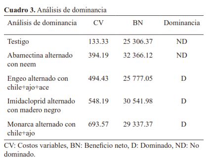 Para realizar el análisis de dominancia (Cuadro 3) se tomó en cuenta el análisis de presupuesto parcial, se consideran los costos variables de cada tratamiento, si los costos variables de un tratamiento están por debajo del beneficio neto de la producción, se considera un tratamiento dominado. El análisis de dominancia indica que Engeo alternado con Chile+Ajo+detergente, Imidacloprid alternado con Madero Negro, y Monarca alternado con Chile+Ajo resultaron ser dominados, esto se debe a que presentan menores beneficios netos y mayores costos variables que el resto de los tratamientos por lo que se excluyen en el análisis de la tasa de retorno marginal. |
