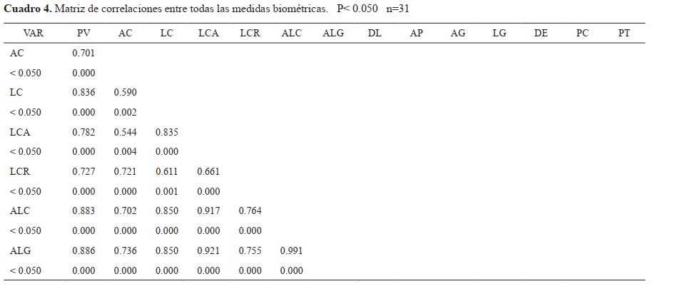 largo de la cabeza LC (0.396) y peso vivo PV (0.395). Las