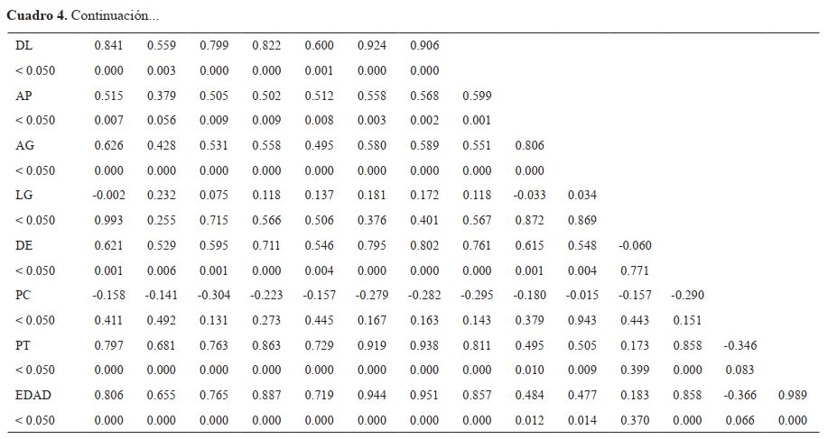 resultaron signifi cativas, con excepción de la correlación entre (AP) y (AC), y (LG) con (PC) cuyas correlaciones no resultaron significativas respecto a todas las demás variables. En base a los índices